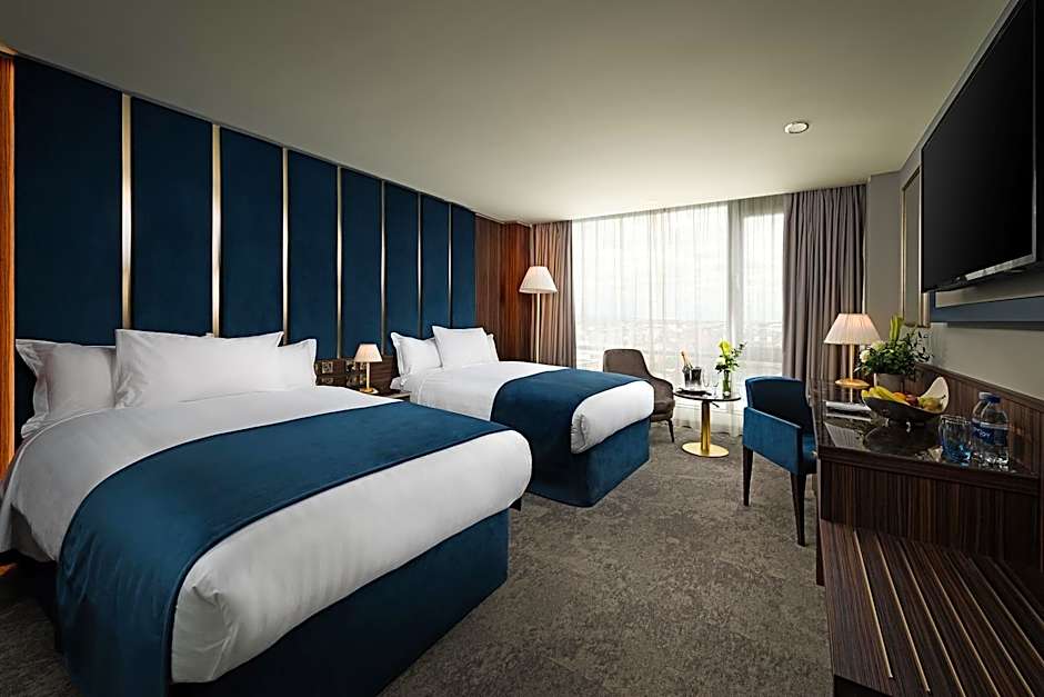 A standard twin room at The Savoy consists of two queen beds. All deluxe twin rooms feature free WiFi, a flat-screen TV with satellite channels, tea/coffee making facilities and mini-bar. The private bathroom comes with a bath with a shower over, bathrobes and free toiletries. Extras include a safe, ironing facilities and a desk.